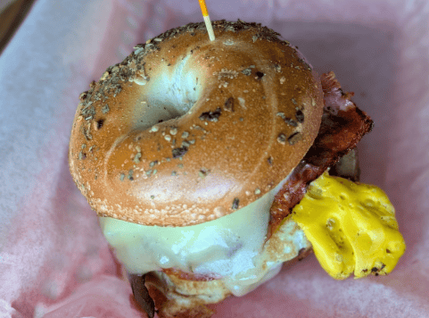 You order at the window and find a seat. The Spicy — capicola, egg, cheddar, roasted jalapeño, caramelized onion, and house-made hot sauce on a spicy Italian bagel — delivers on its name.